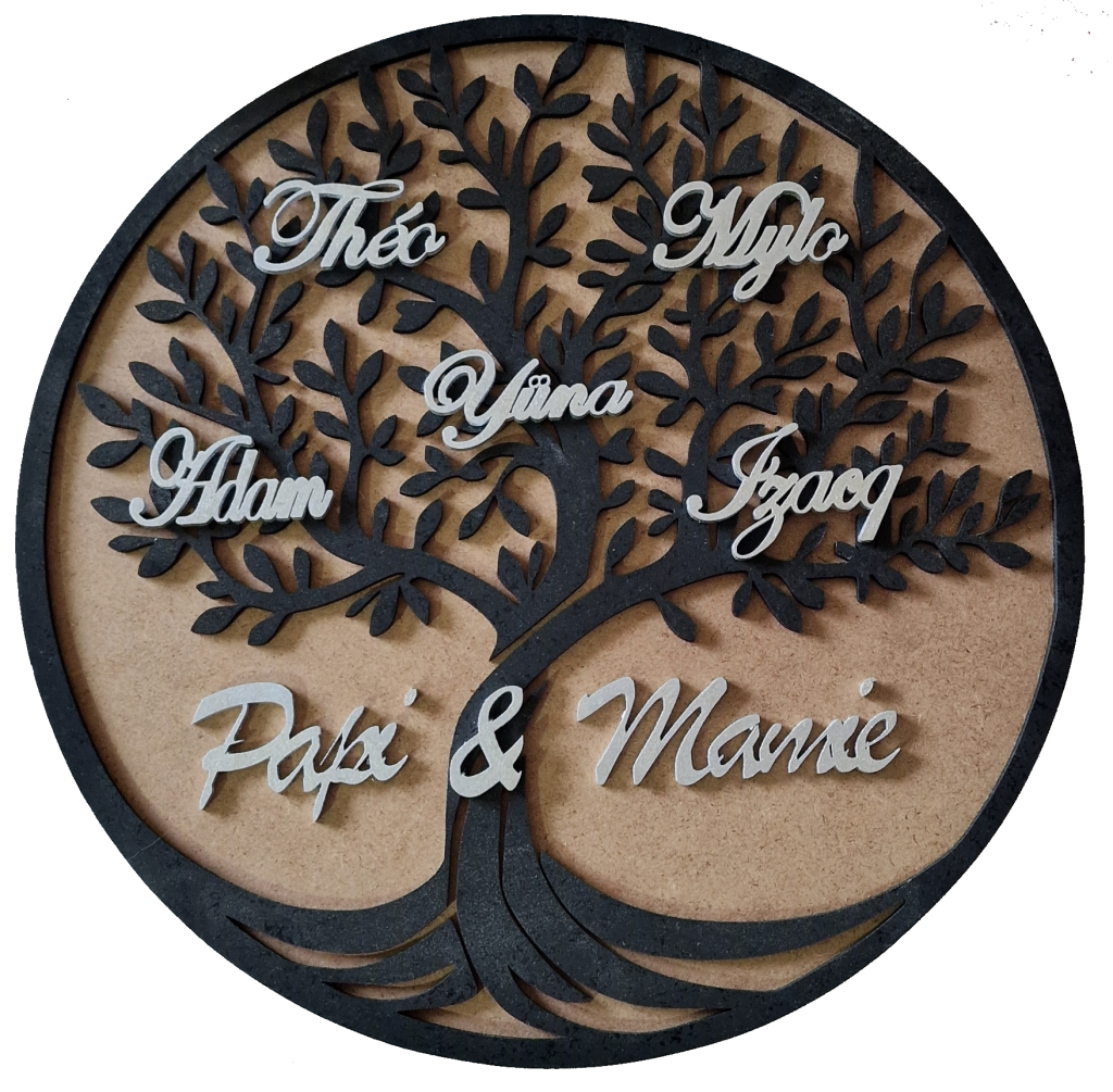 Fond couleur bois – arbre noir – Ecriture argentée – Attache Murale – Maxi – 4 à 5 Prénoms