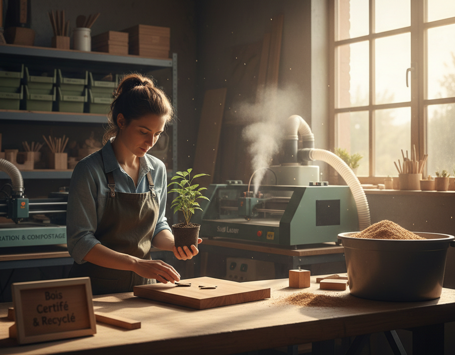 – Matériaux biosourcés : Nous privilégions le PLA (issu d’amidon de maïs) pour la 3D et des bois certifiés pour le laser dès que possible.